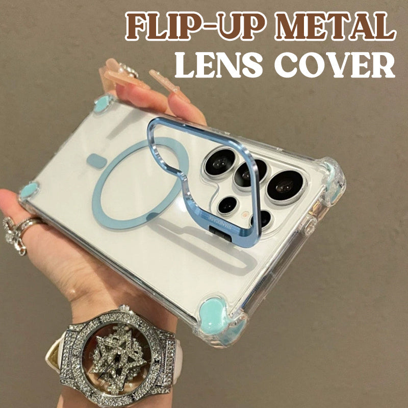 Strong magnetic attachment for instant wireless charging and support for magnetic car mounts & accessories. - 🔄 Flip-Up Metal Lens Cover = Kickstand